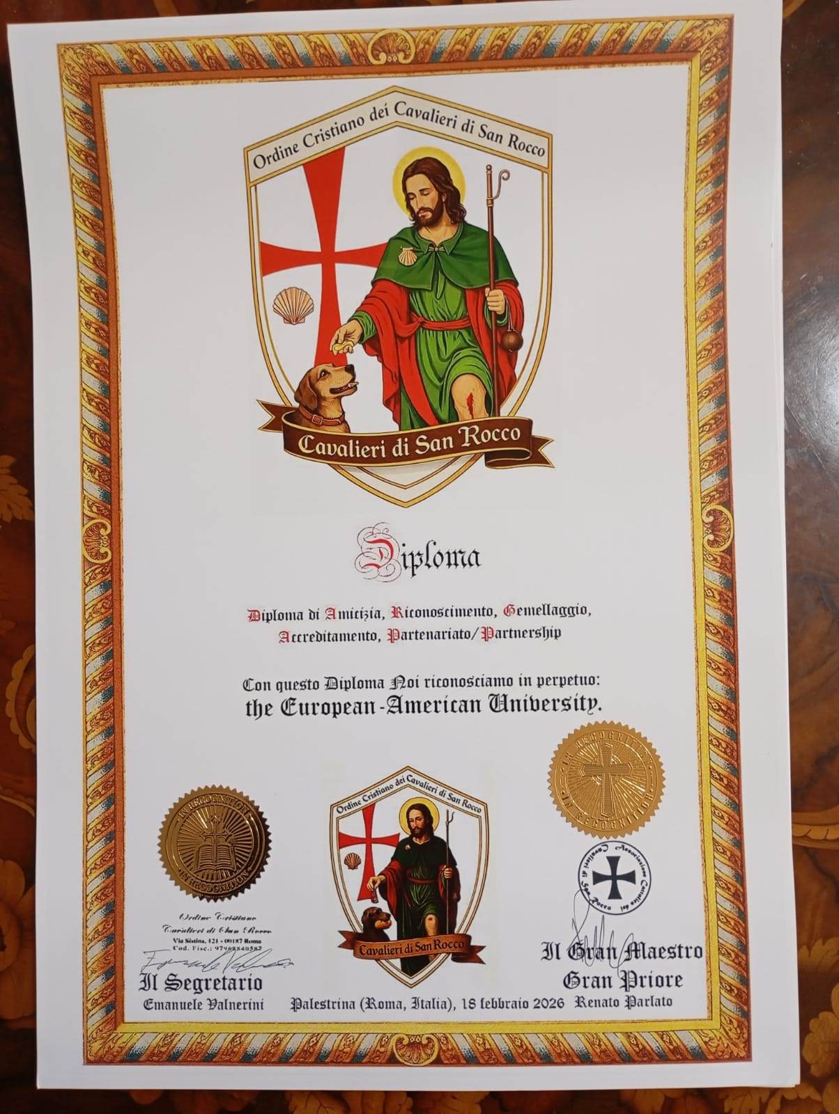 European-American University and several of its constituent institutions have entered into reciprocal agreements of Full Collaboration, Partnership, Accreditation and Recognition with the Ordine Cristiano dei Cavalieri di San Rocco. The Knights of San Rocco are a knightly order organized as a Christian fraternity with close ties to the Roman Catholic Church who reflect the widespread devotion to San Rocco, a medieval Franciscan Tertiary whose life and miracles are the subject of many popular celebrations throughout Italy.