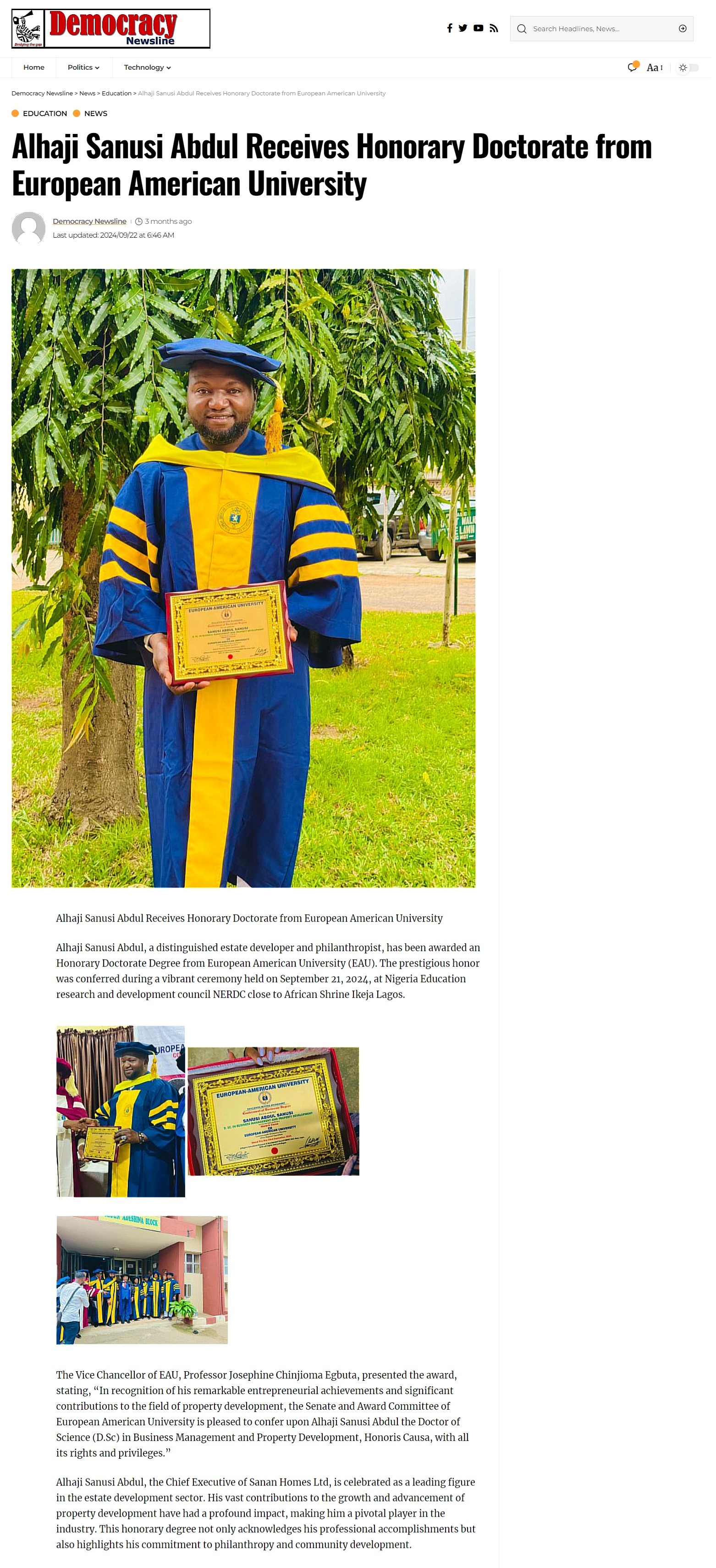 Alhaji Sanusi Abdul Receives Honorary Doctorate from European American University On September 22, 2024December 21, 2024 By johnkersey