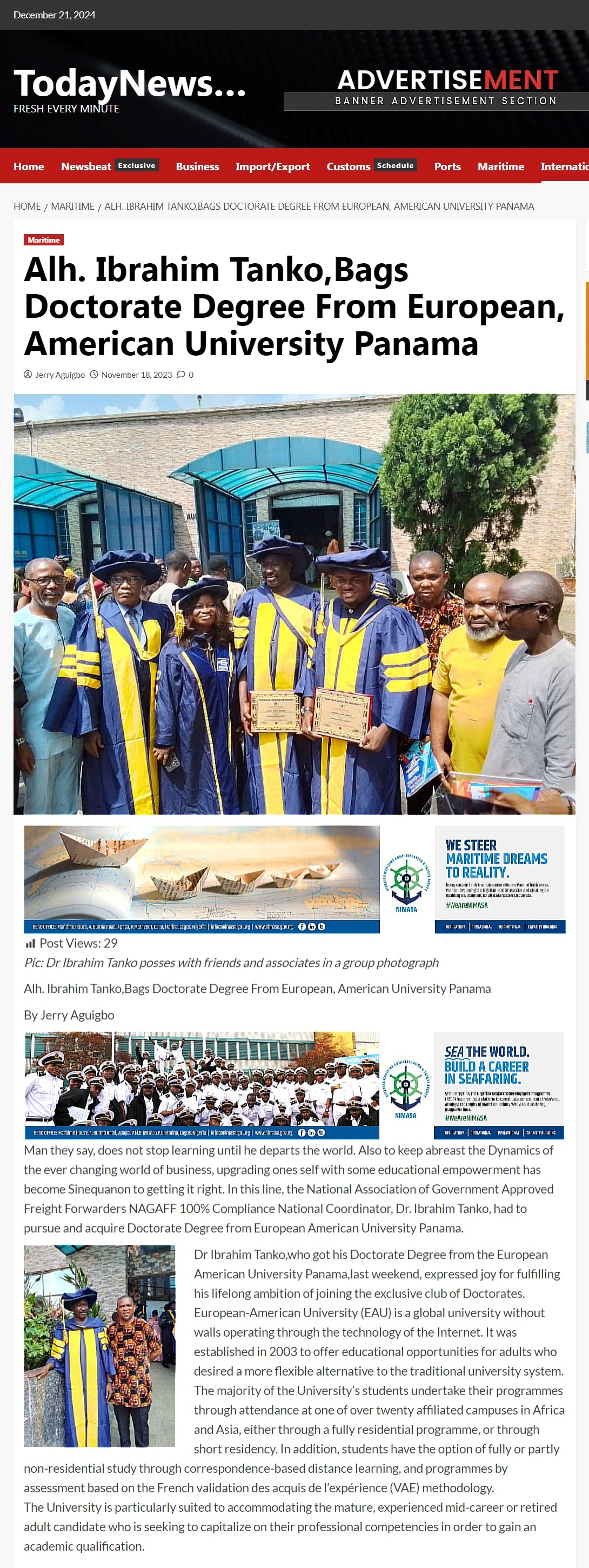 Prof. Ahmed Mohammed Sanusi (shown right in the photograph) who is Professor of Criminal Justice at European-American University was recently honoured by a Special Achievement Award. Prof. Sanusi serves as Deputy Commissioner of Police in the Nigeria Police Force. The award was presented by the Inspector General of the Nigeria Police Force.