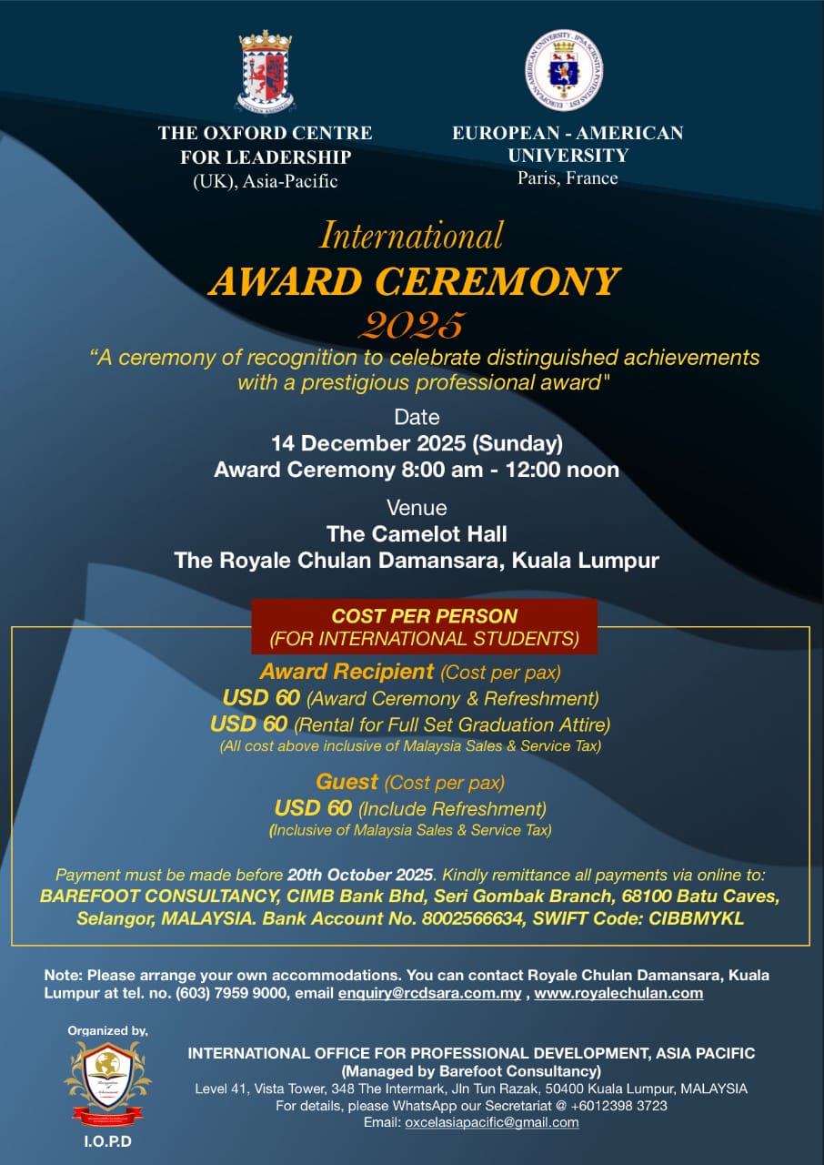 The University’s honorary degree programmes in respect of African honorands are now co-ordinated in Togo by Professor Klousse Komlan John (Pro-Vice-Chancellor) and in Nigeria by Professor Luke Okojie (Pro-Vice-Chancellor). Bedopps International Services in Nigeria is also authorized to recommend persons for honorary degree conferral. The University will announce and feature all future honorary degree ceremonies on its website.